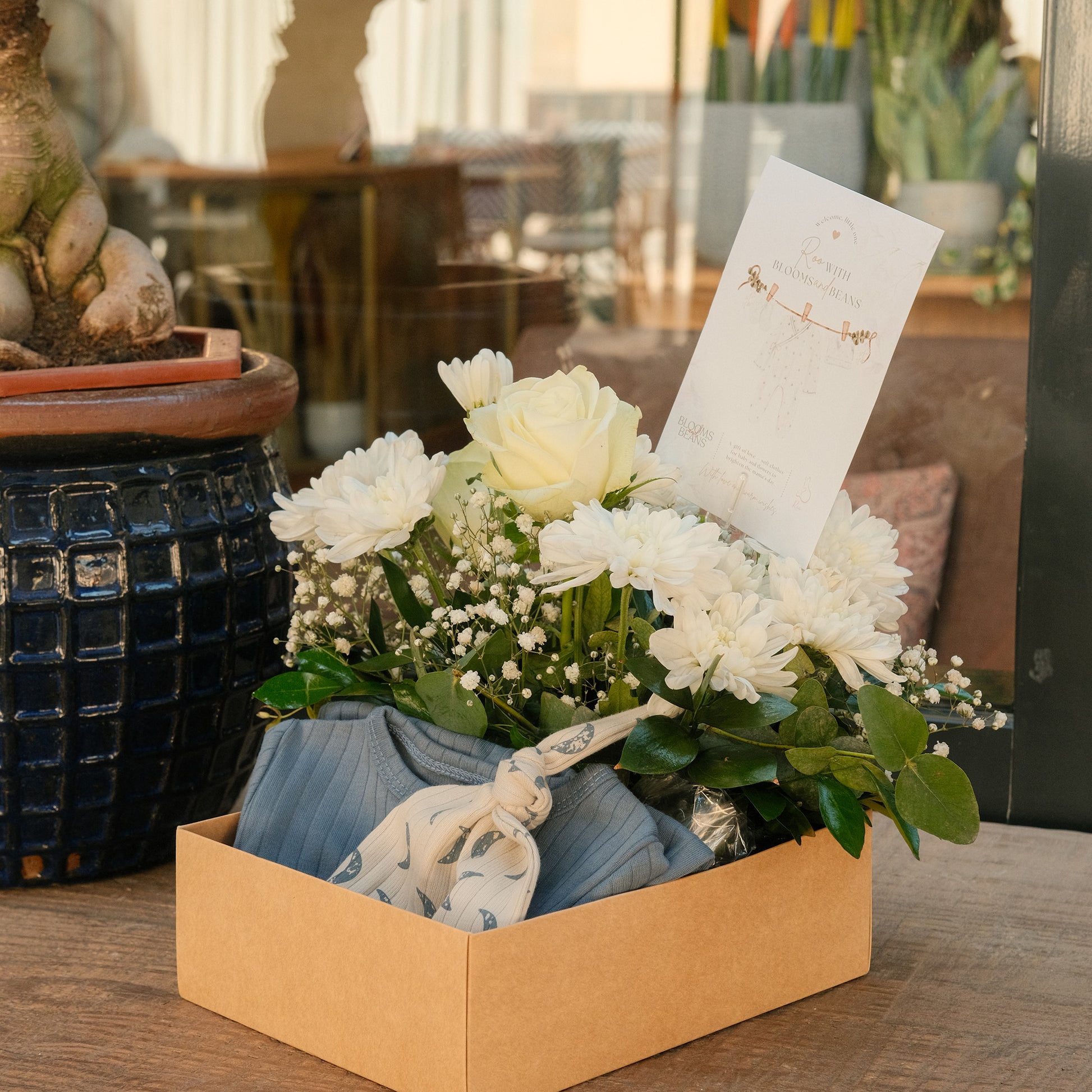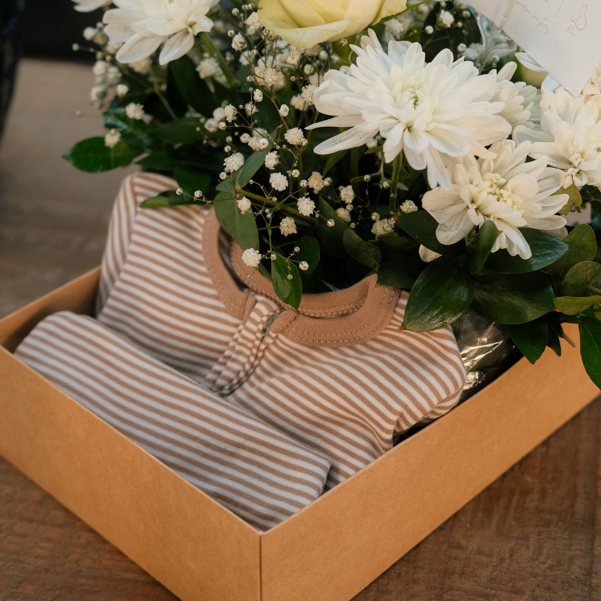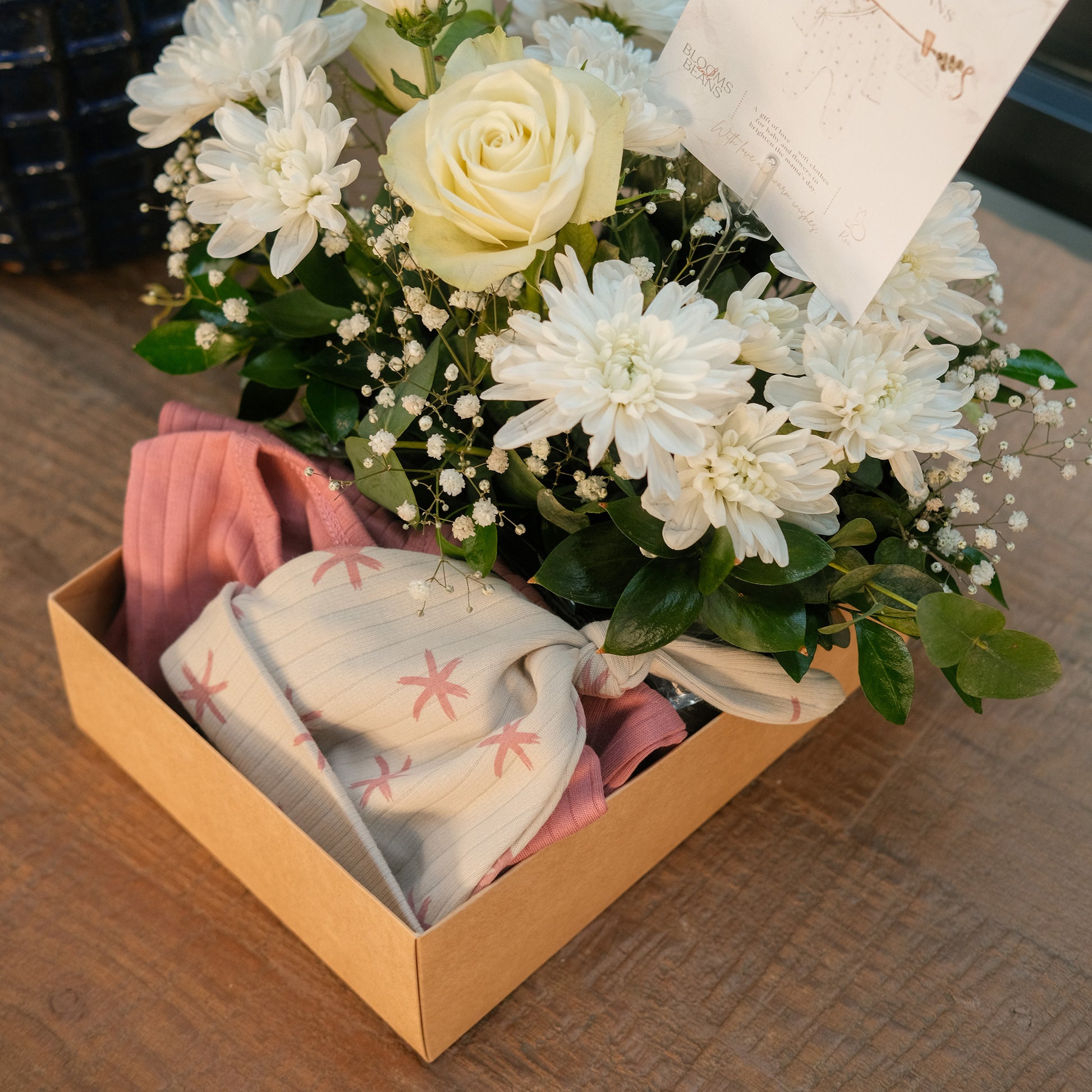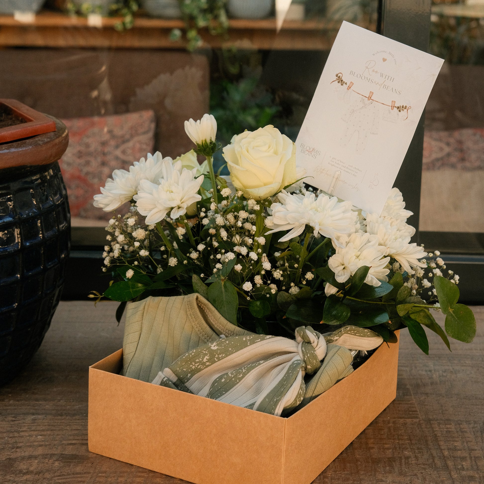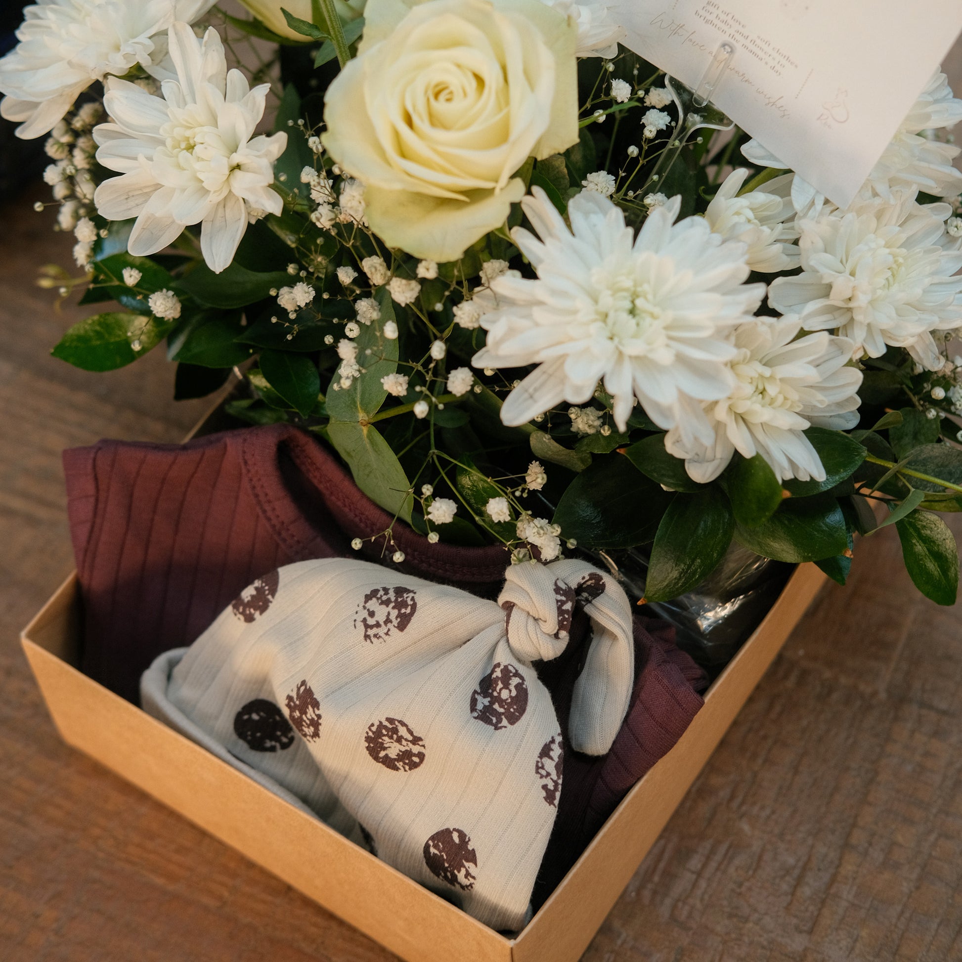 A petite box for tender hellos — a butter-soft Roo onesie and hat tucked beside hand-tied seasonal blooms. The kind of gift that whispers warmth and love without needing to say a word.