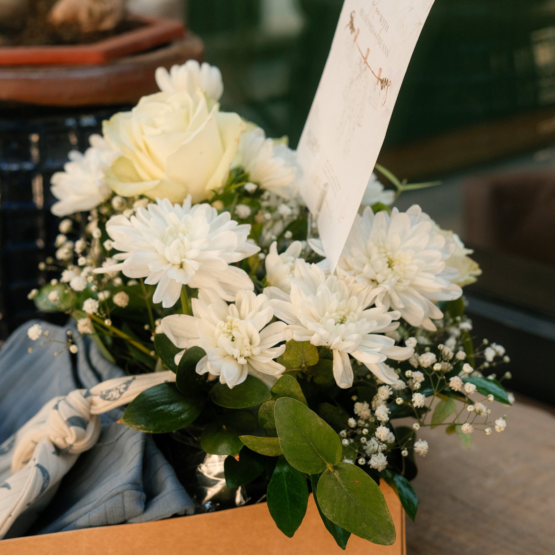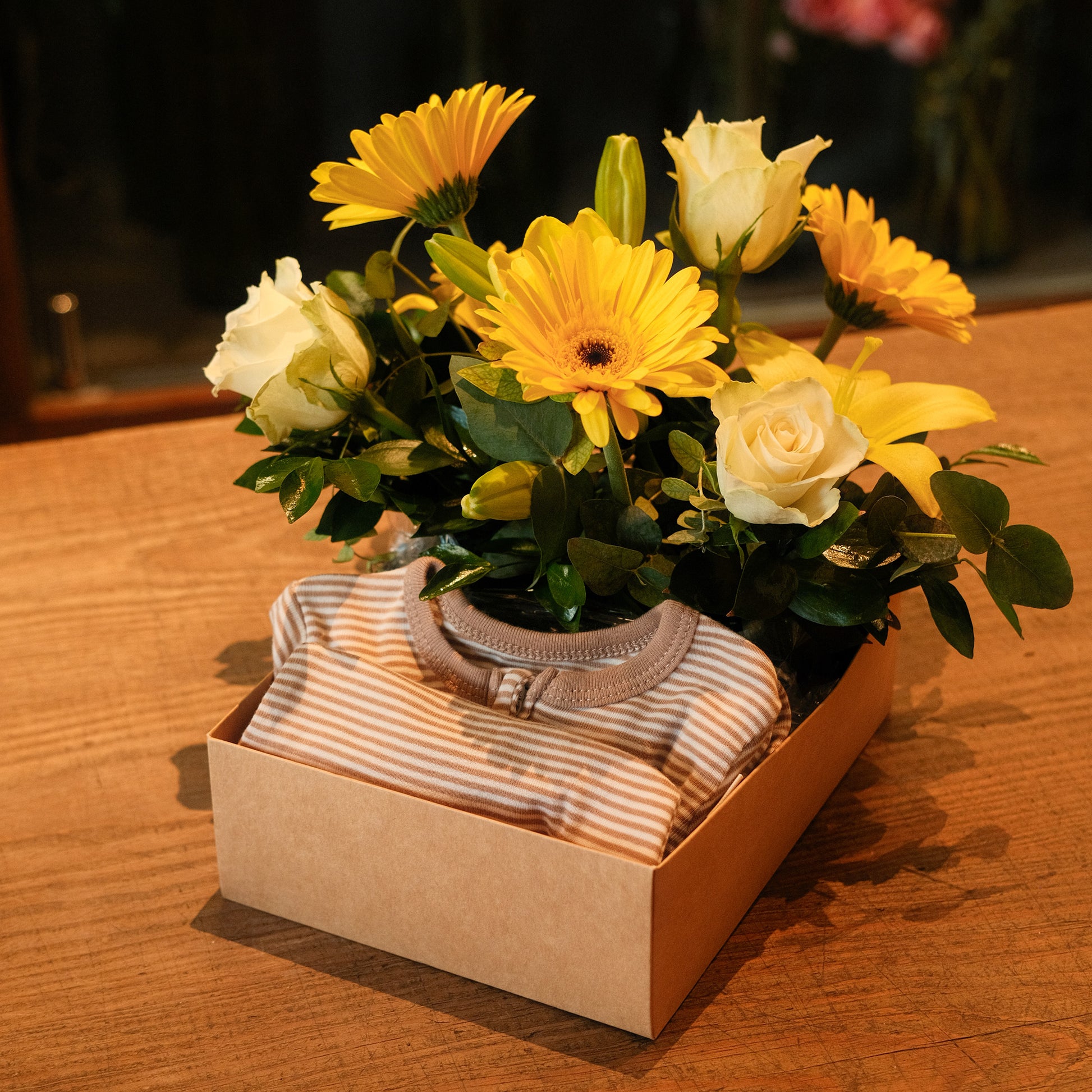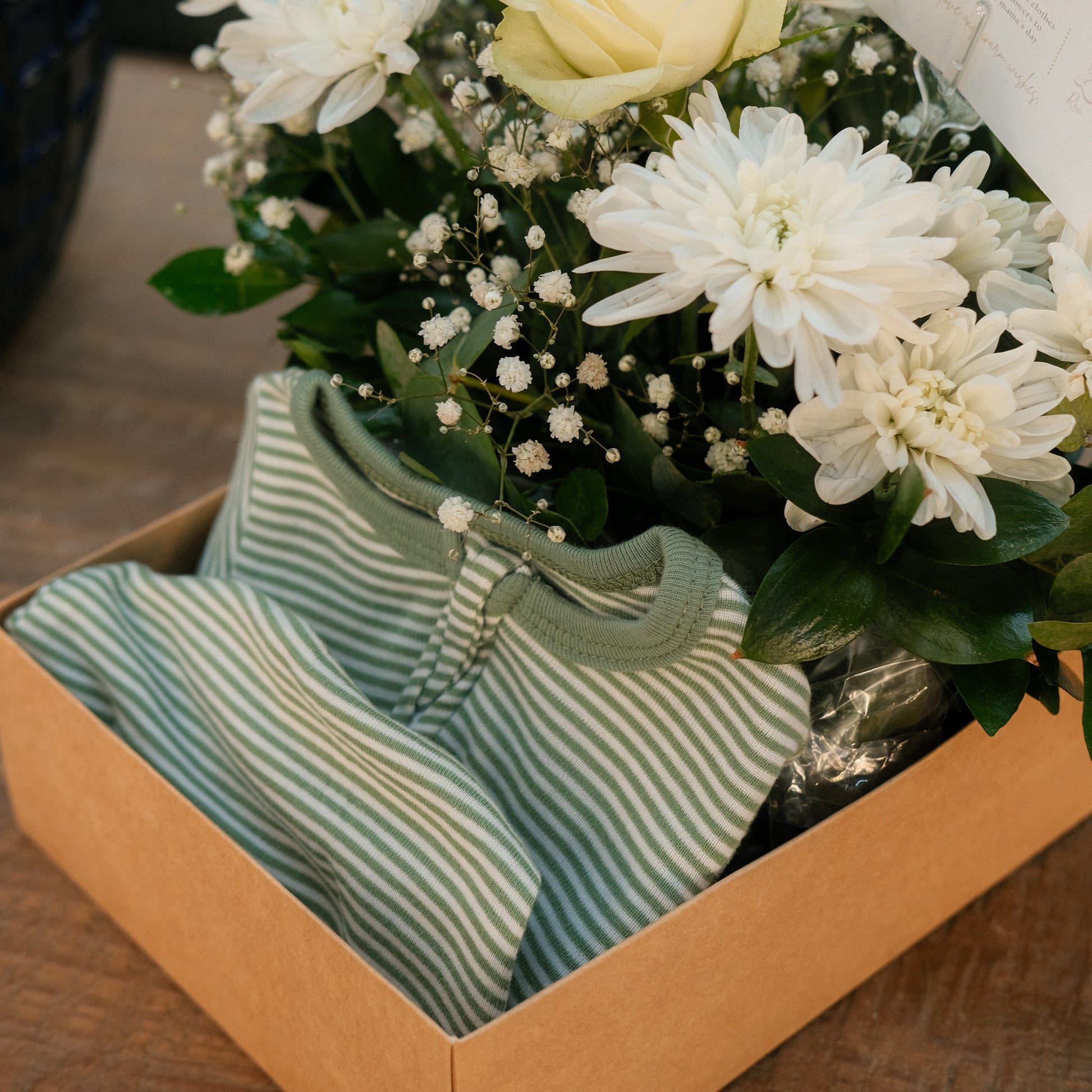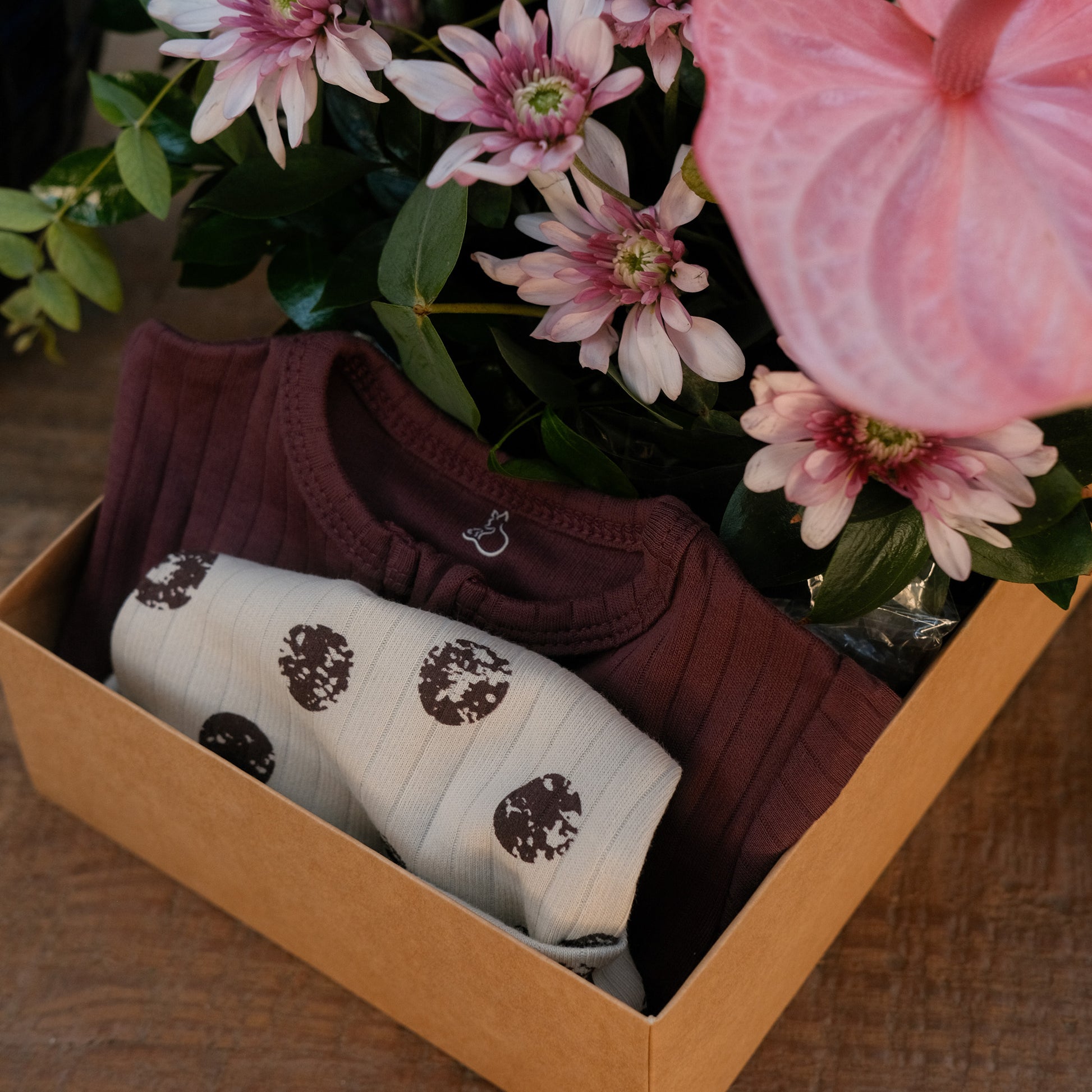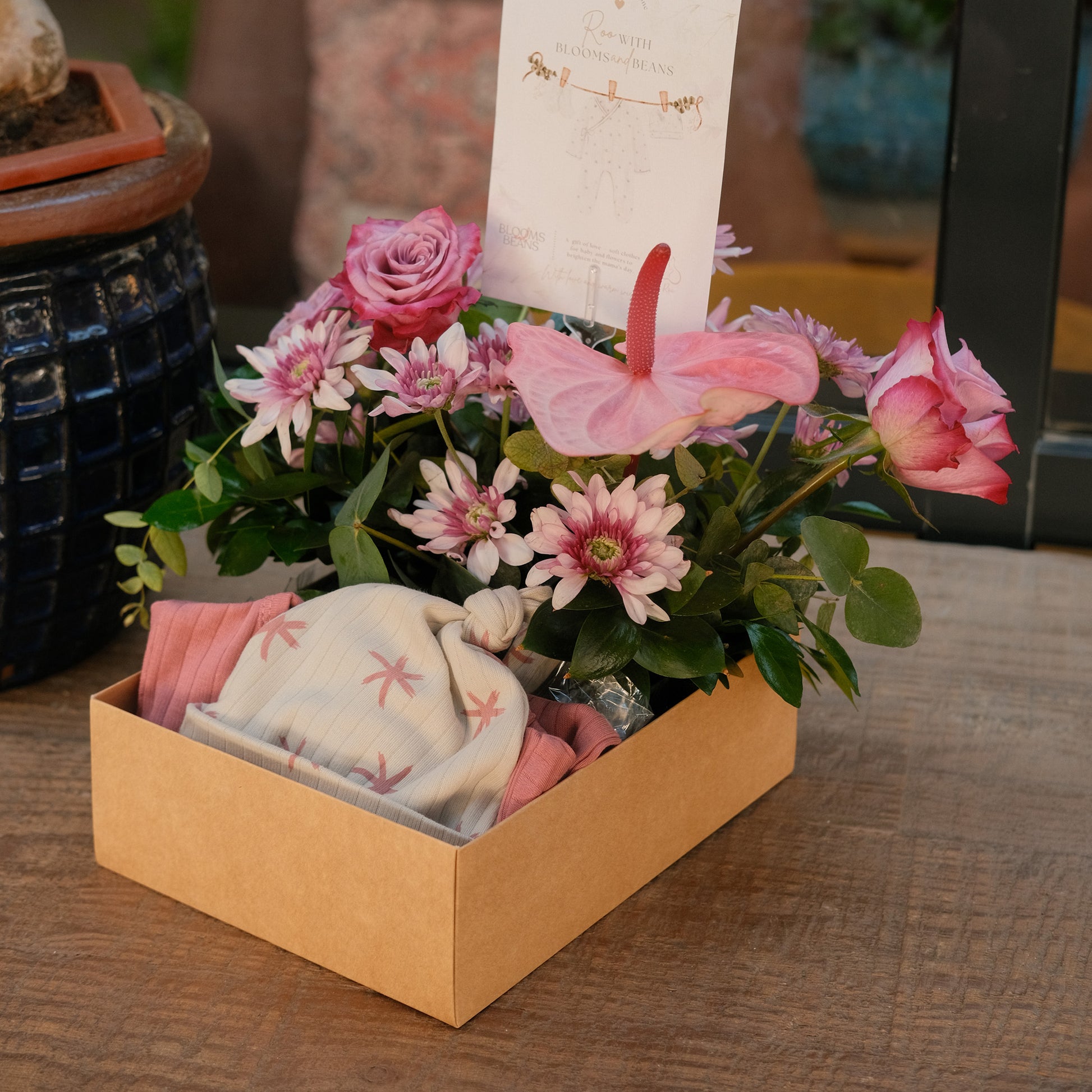 A petite box for tender hellos — a butter-soft Roo onesie and hat tucked beside hand-tied seasonal blooms. The kind of gift that whispers warmth and love without needing to say a word.