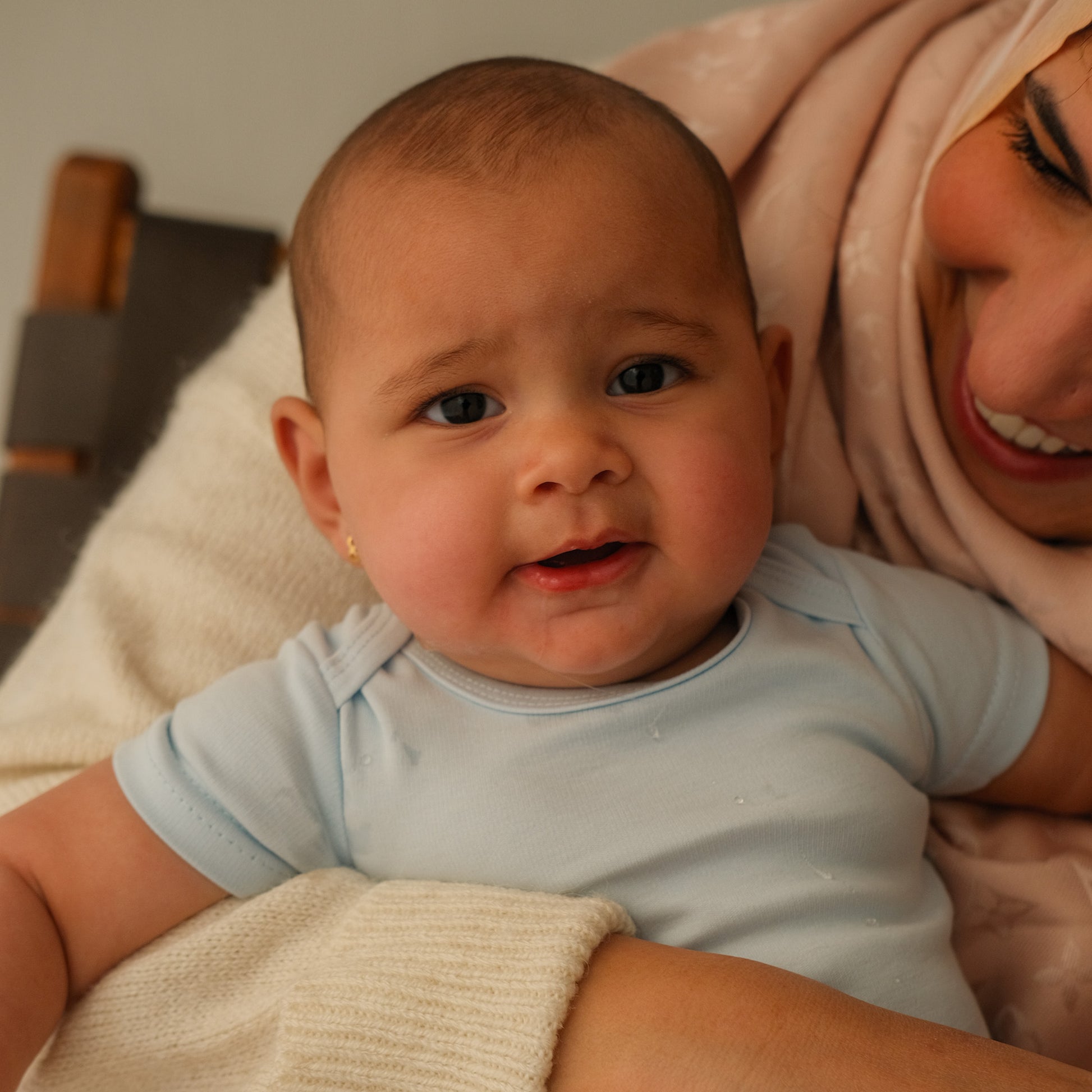 Soft, timeless, and essential; crafted in classic sky blue, the perfect everyday layer to stack up on. As your little one grows and gets more mobile, the fold-over neckline and easy poppers make dressing quicker and fuss-free.